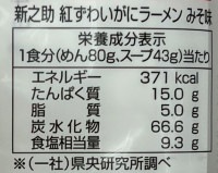 ●原材料名:【めん】(小麦粉(国内製造)、米粉、小麦グルテン、食塩/かんすい、増粘剤(アルギン酸エステル)、くちなし色素)、【添付調味料】(味噌、食塩、食用油脂、魚介エキス、砂糖、ポークエキス、玉ねぎ、にんにく、たん白加水分解物、ごま、生姜、紅ズワイガニ殻粉末、胡椒、唐辛子/調味料(アミノ酸等)、酒精、増粘剤(ジェランガム))、(一部に小麦・かに・牛肉・ごま・大豆・豚肉を含む)